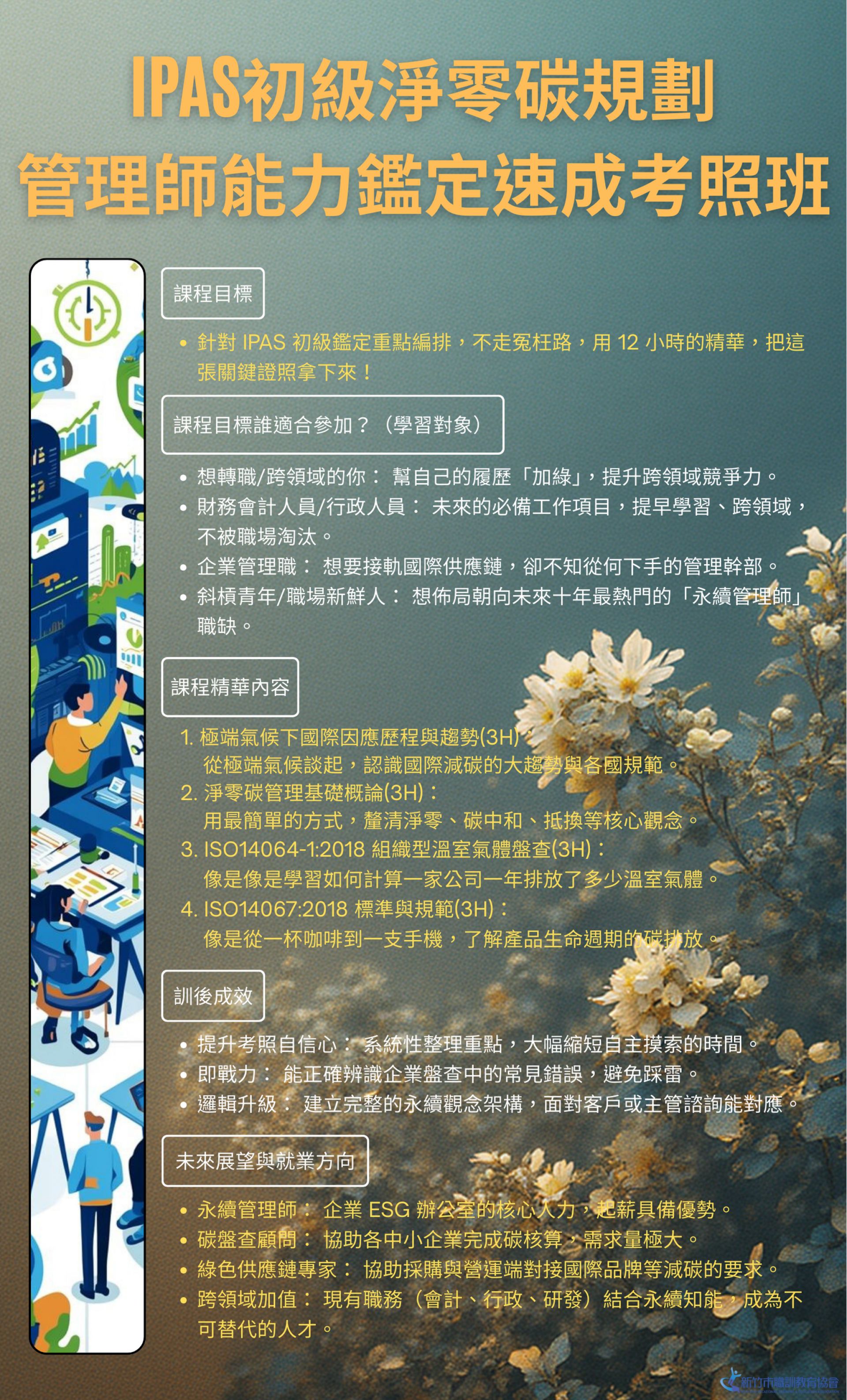 本課程係提供有志於進入永續與碳盤查相關專業領域工作者,提供淨零碳規劃管理與淨零碳盤查規範與程序實務課程,上課方式以考照重點說明為主,並以有邏輯的講解方式,帶領同學快速地掌握初級淨零碳規劃師所須之技能與注意事項。