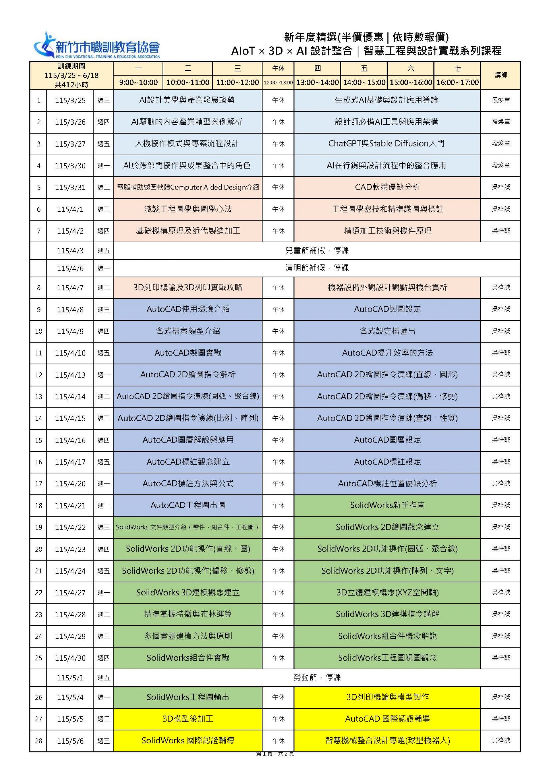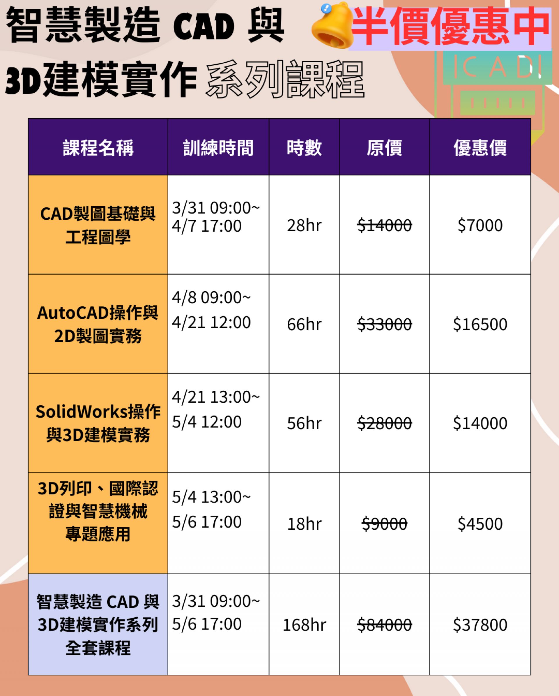 模組一|CAD製圖基礎與工程圖學、模組二|AutoCAD 操作與 2D 製圖實務、模組三|SolidWorks 操作與 3D 建模實務、模組四|3D列印、國際認證與智慧機械專題應用